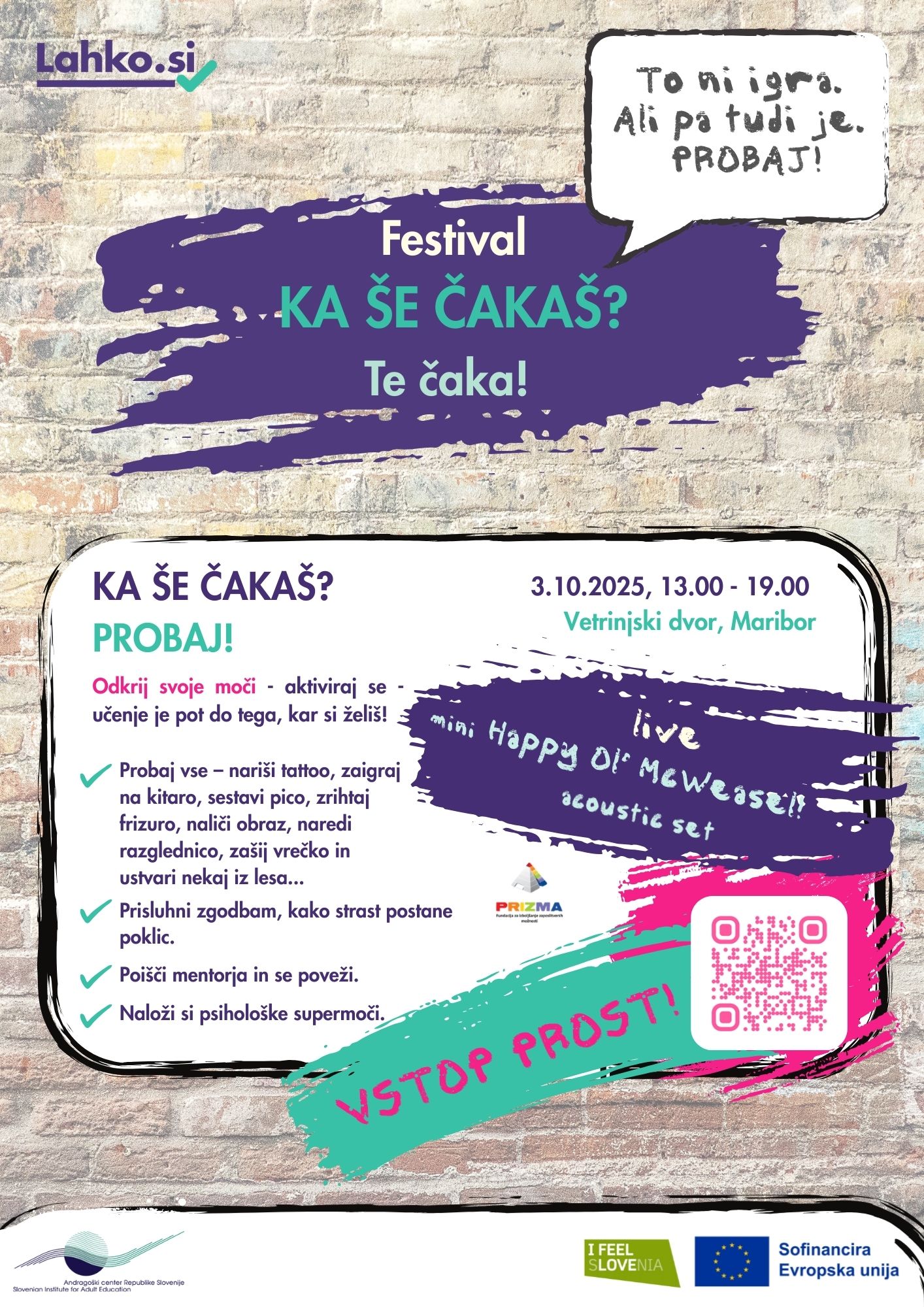 Maribor bo v petek, 3. oktobra 2025, postal središče ustvarjalnosti, glasbe in novih priložnosti! V Vetrinjskem dvoru bo med 13. in 19. uro potekal festival »Ka še čakaš? Probaj!«, namenjen mladim, ki želijo raziskovati svoje interese, preizkušati različne dejavnosti in pridobiti motivacijo za prihodnost.