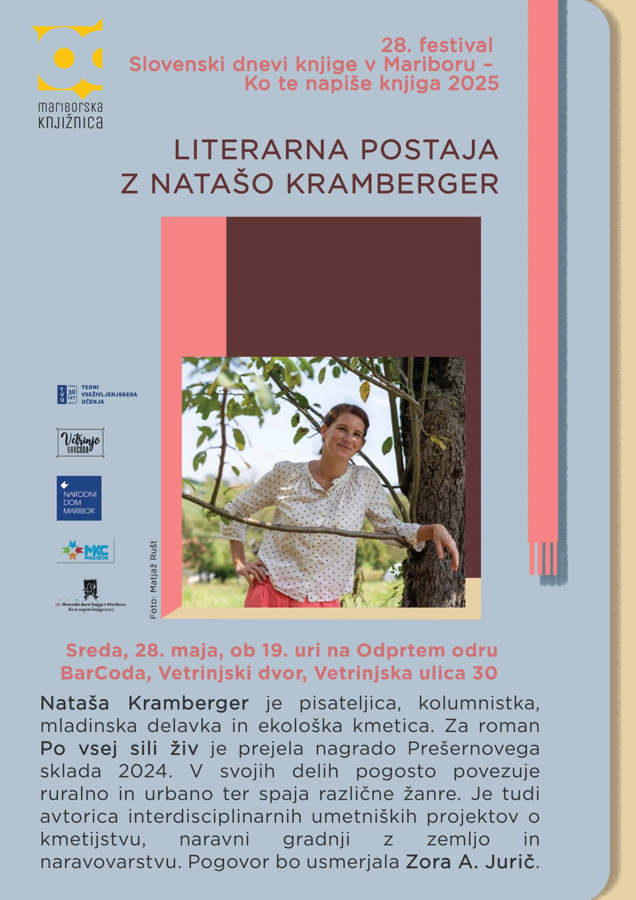 Osrednja gostja 28.festivala Slovenski dnevi knjige v Mariboru je Nataša Kramberger, pisateljica, kolumnistka, mladinska delavka in ekološka kmetica. Za zbirko esejev Po vsej sili živ je prejela nagrado Prešernovega sklada 2024. V svojih delih pogosto povezuje ruralno in urbano ter spaja različne žanre. Je tudi avtorica interdisciplinarnih umetniških projektov o kmetijstvu, naravni gradnji z zemljo in naravovarstvu.