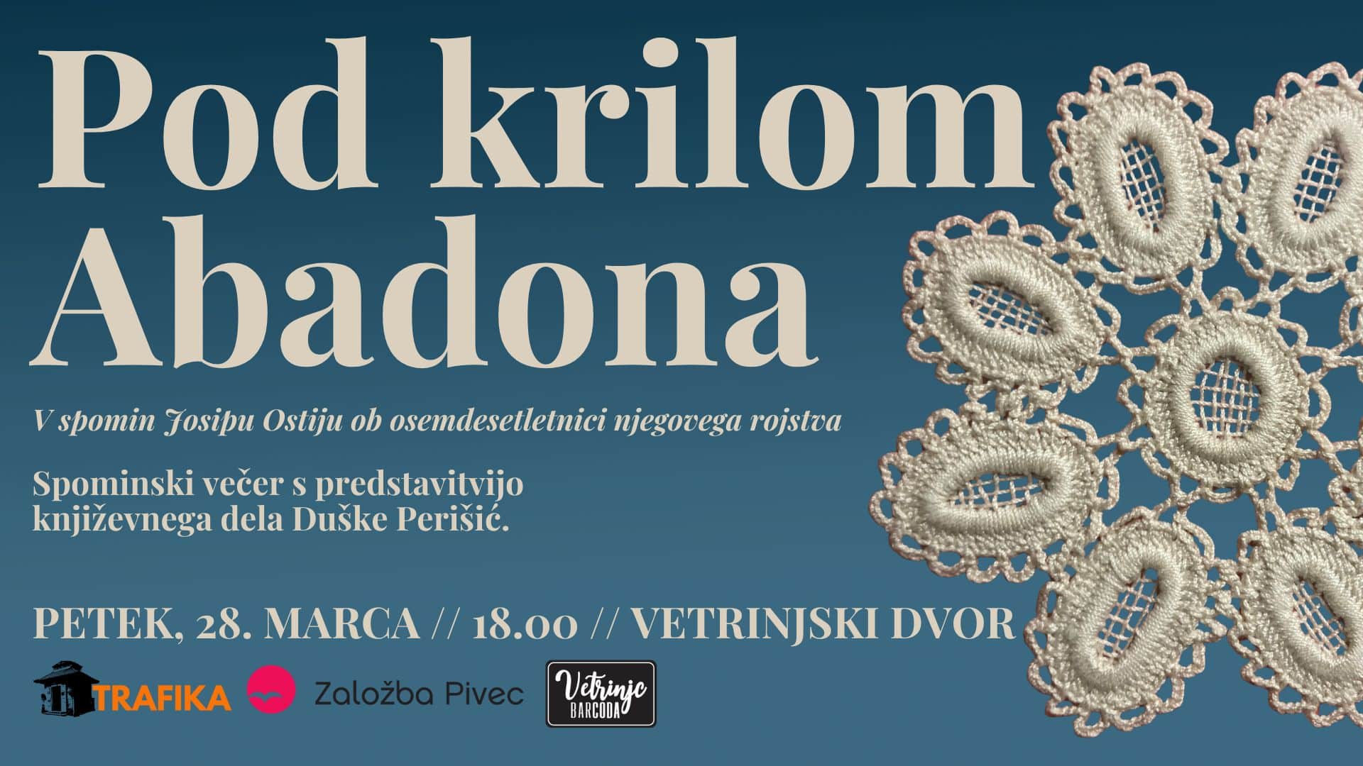 Mineva 80 let od rojstva Josipa Ostija. V spomin na velikega pesnika in pisatelja smo skupaj z Založbo Pivec pripravili slovensko izdajo radijske igre Pod krilom Abadona, ki jo je napisala njegova prva žena in ena njegovih največjih ljubezni, Duška Perišić.